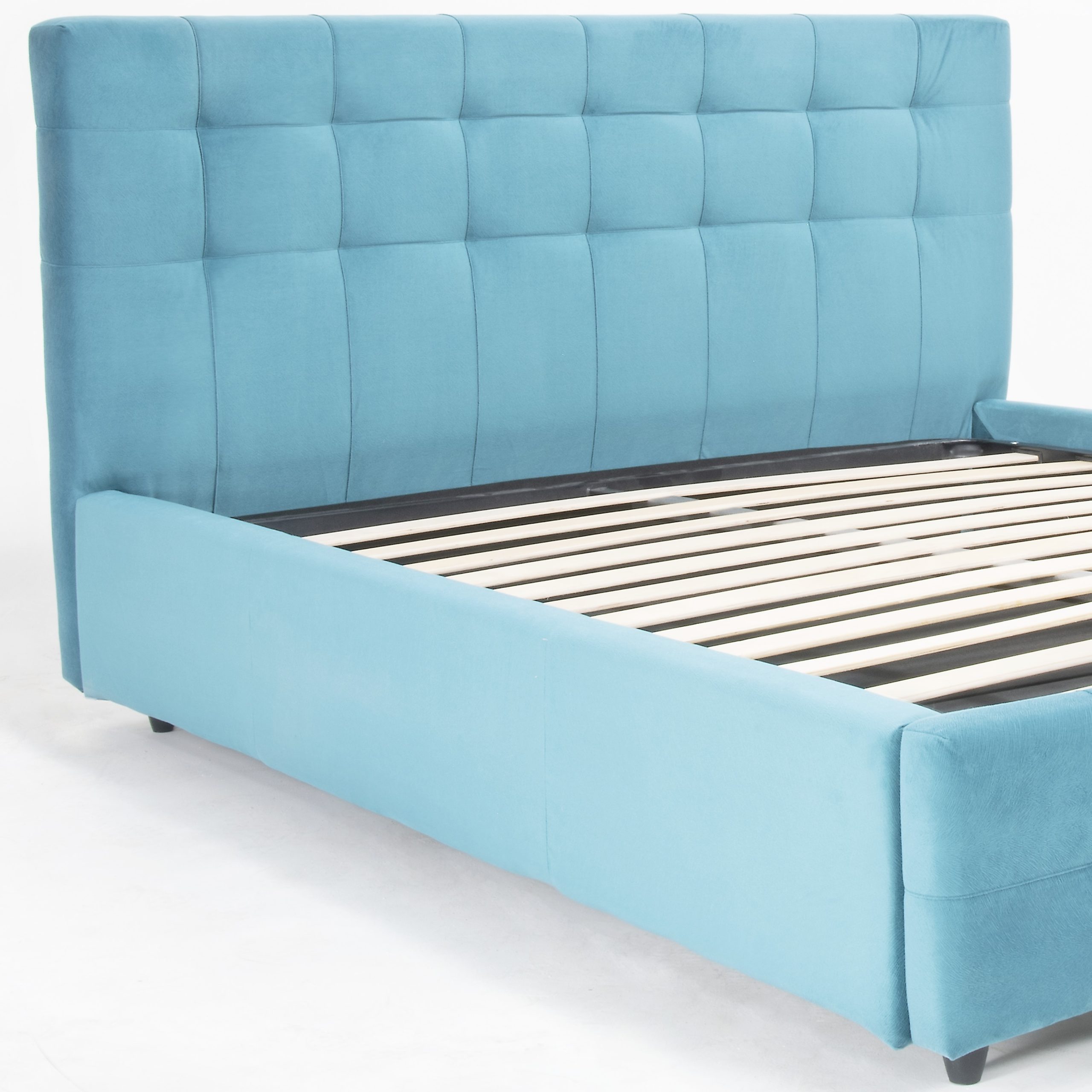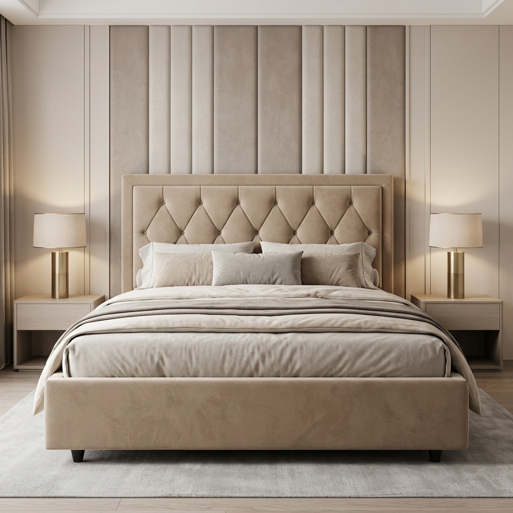 Tăblia de la capul patului și cea de la picioare sunt împărțite în pătrate uniforme, oferind un efect vizual ordonat și contemporan. Acest detaliu conferă patului un aspect îngrijit și îl transformă într-un element central al dormitorului, fără a-l încărca vizual.