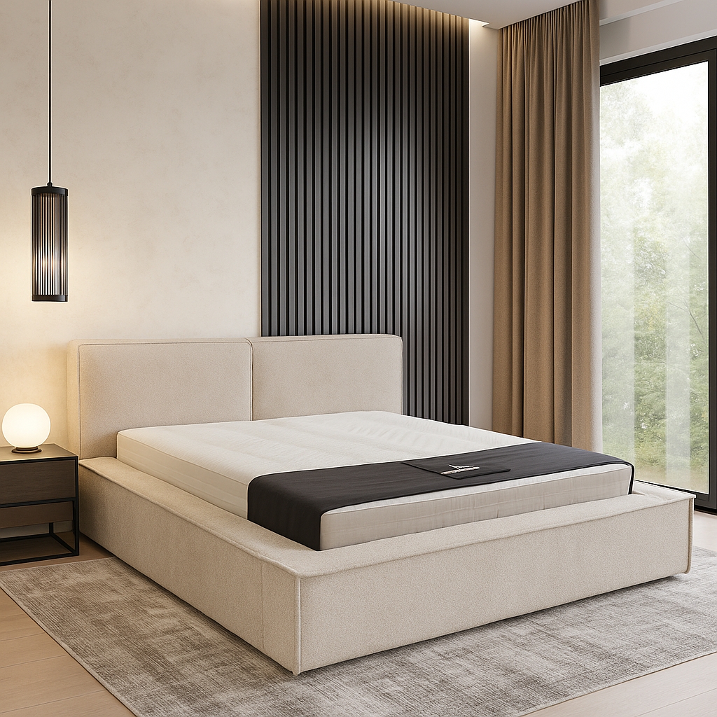 *Toate imaginile sunt cu titlu de prezentare. Prețul afișat include cadrul patului, somiera si mecanismul de liftare. Din înălțimea saltelei 4 cm vor intră în cadranul patului (salteaua NU este inclusă). Prețul afișat NU include montajul, salteaua și niciunul dintre ornamentele de decor din imaginile de prezentare ale produsului. Aspectul tăbliei patului poate diferi în funcție de lățimea aleasă. Nuanța tapițeriei pot diferi în funcție de display-ul dumneavoastră și lumina ambientală/ natural.